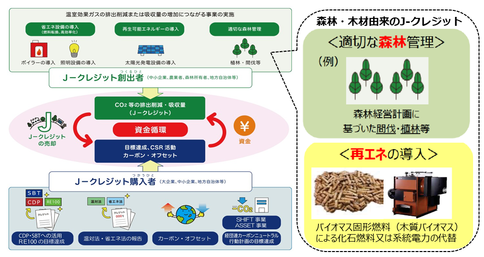 省エネルギー設備の導入や再生可能エネルギーの利用による排出削減、そして森林の適切な管理によるCO₂吸収など、さまざまな環境貢献活動がJ-クレジットの発行対象となります。
